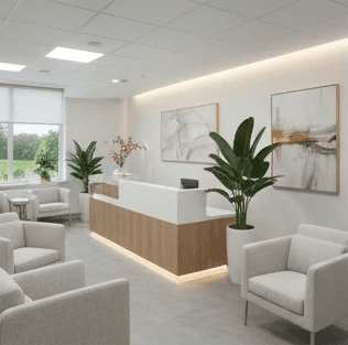 A multi-specialty medical suite designed to balance patient comfort with efficient staff workflows. Walkable floorplans were used to review exam room sizes, circulation, and ADA clearances with both doctors and administrators.
